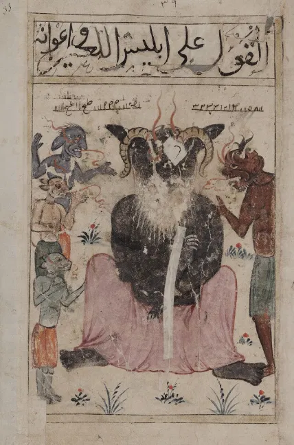 The illustration of the devil is the first in this series. Its title, Iblis al-la‘in (Iblis the cursed), leaves no doubt to whom this image depicts. Iblis is shown enthroned in the center of the page sitting frontally and in a regal manner. He is crowned with large ram horns and his eyes blaze with fire. He is much larger than the other djinn, his subjects, and seems closer to the observer than them.