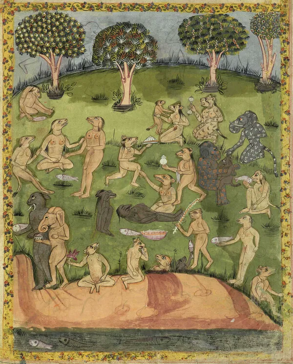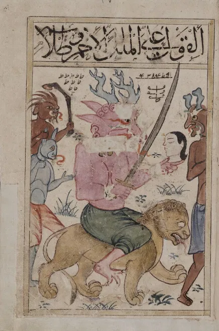 The original codex of Kitab al-Bulhan came apart and some of its pages were lost, and the others became mixed up and were bound together in a random and incoherent order. The manuscript is made up of texts dealing with the topics of astrology, astronomy, and geomancy. “The most interesting section…” of Kitab al-Bulhan, according to Stefano Carboni, is “…a series of extraordinary full-page illustrations that require interpretation because the only way to understand their subject – in addition of course to having enough familiarity with its iconography in order to decipher correctly the scene represented in the painting – is by reading its title placed in large letters at the top of the page. There is no text (and never was) associated to these works, which makes this section intriguing, fascinating, and unique in this period of development of Islamic book illustration.” The part of the book that Carboni is describing contains a series of illustrations depicted demons and djinn. Other than the title, there is no text and as Carboni states, one is left having to interpret these images.