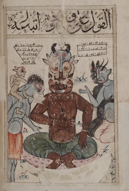 Humma is the last of the djinns illustrated in Kitab al-Bulhan. Humma is “the fever” and thus a bringer and spreader of illness. In the image, he is three-headed and frontally seated with his arms wide as if he were going to embrace his next victim and cause him to be ill.