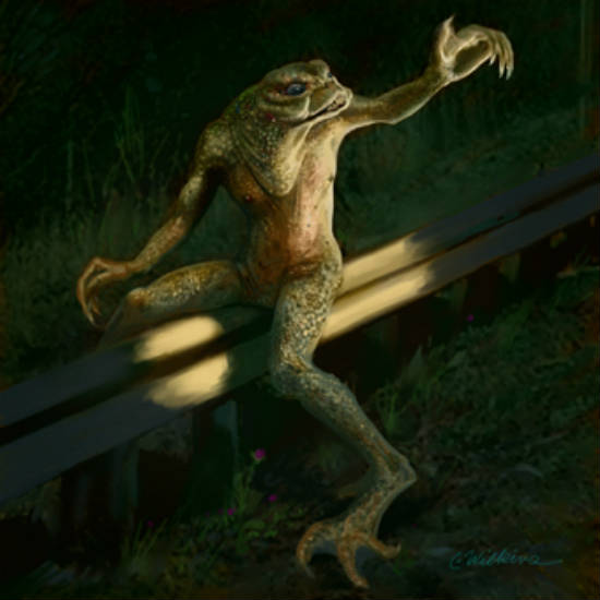Loveland, Ohio, has multiple sightings recorded of an unusual reptile, which has become known as the Loveland Frog. The most famous sighting was by police officer Ray Shockey in 1972. He saw an animal lying beside the road, and when he approached, it got up on two legs and ran away! He described it as three to four feet tall, about 60 pounds, with a face like a frog or a lizard. Officer Mark Matthews had a similar encounter a couple of weeks later. The story grew as it was retold, and the original officers say they never thought the creature was a monster, but possibly an escaped pet. However, there have been other sightings, particularly one from 1955. A businessman reported that he saw three creatures beside the road that were three to four feet tall and had wrinkles on their heads instead of hair, and webbed hands and feet. The most bizarre thing about the earlier sighting is that one of the creatures waved a wand that emitted sparks! Image by Cathy Wilkins.