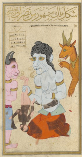 The title specifying that he is nasrani (‘Christian’), who is also known from some sources as Abu al-Walid or ‘Father of the Child’ (opposite). This is probably the reason why he is represented with a naked child in his hands, held upside down, although it is unclear whether Shamhurash’s influence over him is positive or negative. The talismanic symbols are complex and include also the hexagon, the ‘Seal [on the ring] of Solomon’ (khatam sulayman) which is formed by two triangles, one upright and the other upside down, symbolising the entire universe combining the upper and lower spheres.